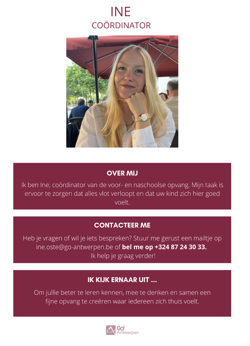 • De opvang kost 1,15 euro per begonnen half uur. Je krijgt een maandelijkse afrekening via de schoolfactuur.